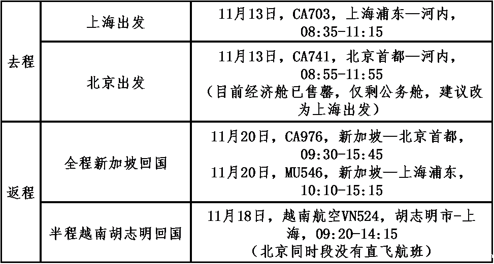(2)为了方便组团出行,国内飞越南河内和新加坡回国(以及胡志明回国)的经济舱机票建议按照如下推荐的往返航班号自行预订(不按照此日期和航次预定的行程,主办方不承担机场的接送)。参团成员也可委托主办方按如下表格信息代订(按实际出票时间当时价格为准)。分区域推荐的往返经济舱航班号、起降时间如下: