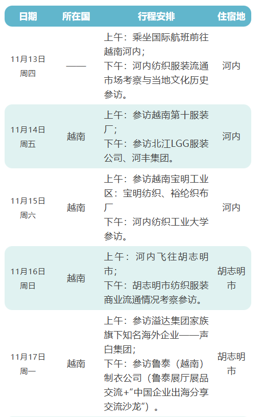 全程暂定覆盖越南纺织服装领军企业国有第十服装厂,北江LGG(波司登、优衣库等品牌合作方),河丰集团,越南本地头部纺织印染企业宝明纺织,裕纶织布厂,越南纺织服装专业高等院校河内纺织工业大学,溢达集团海外公司声白集团,山东鲁泰国际布局的越南鲁泰公司,APTEXPO新加坡•亚太展,世界著名学府新加坡南洋理工大学等,通过零距离的直面接触和深度学习考察,力争促成国内外纺织服装行业及企业之间的学习交流与合作共赢。